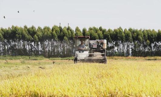 6月27日,记者在雷州市附城镇看到,该镇大面积连片的水稻正值收获季节,收割机在金灿灿的稻浪中穿梭,好一派丰收喜人的景象。