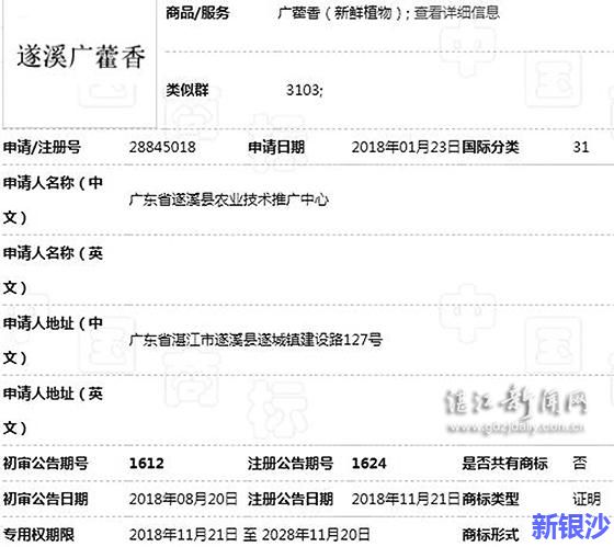 与此同时,该局结合暖企服务活动,组织岭南中药材地理标志商标注册专项工作小组,为岭南中药材生产经营企业送法上门,指导企业注册商标。市工商局加强对雷州市、遂溪县市场监管局的工作指导,建议当地政府以注册地理标志证明商标方式加强对广藿香的法律保护。遂溪县市场监管局主动牵头指导注册遂溪广藿香地理标志证明商标,跟踪商标申请受理、审查、核准等环节工作进展情况,对遇到的问题及时做出指导意见。2018年11月20日,遂溪广霍香在第31类(新鲜植物)成功注册地理标志证明商标,湛江市岭南中药材地理标志证明商标实现零的突破,湛江市岭南中药材商标品牌保护迈上新的台阶。