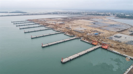 8条突堤伸出海面,4个崭新的红色升降梯醒目地屹立在码头上。徐闻港施工现场如火如荼,机车和工人来往穿梭,1360米长的防波堤紧紧包围着港池,钢结构的临时客运站、查堵楼、综合用房、收费亭等建筑星罗棋布,新港口的雏形已渐渐显现。