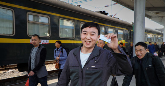 1月21日,在湛江火车站,乘客高高兴兴地踏上归途。