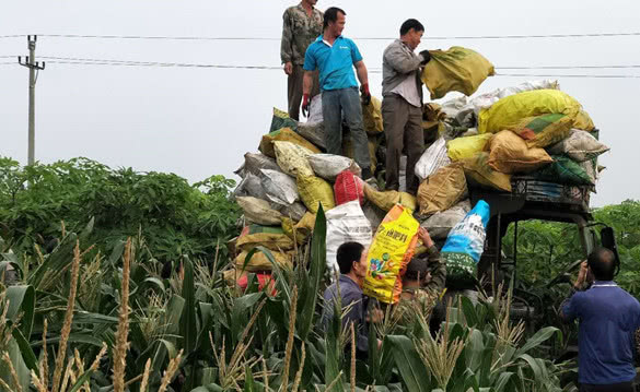 循声望去,地头走来一位40多岁模样、敦敦实实的中年人,左手提着一大袋玉米,右手拎着一大个开水瓶。村民蚊哥介绍,他就是这块地的主人,叫沈敏,今年约40岁,当天全村共60多名乡亲“换工搭伙”为沈敏、杨利、陈元生、陈四等四户人家摘玉米。