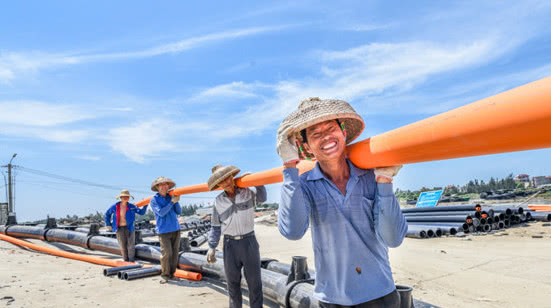 5月16日,徐闻西连镇海边气温突破33℃,烈日下的西连镇水尾渔港千帆林立,一片宁静。在码头附近的徐闻县源海水产养殖有限公司基地上,水尾村的渔民陈妃浩与几名村民顶着烈日劳作,在制作一具塑料大网箱,现场一派繁忙。