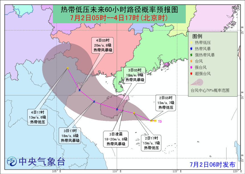 从广东省应急管理厅了解到,南海热带扰动已于1日20时加强为热带低压,预计较大可能于2日夜间以热带低压或热带风暴级(7级~8级)在海南省东部到粤西沿海地区登陆,成为今年影响我省的首个台风。