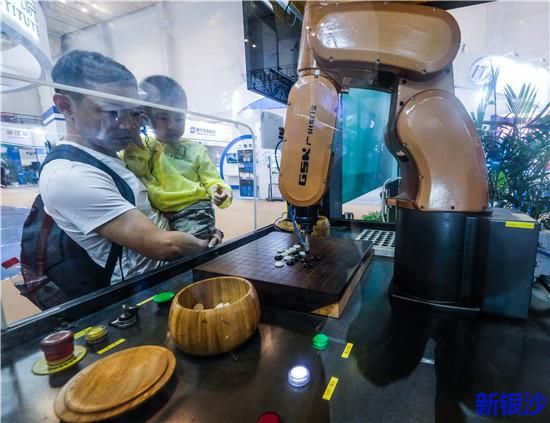 9月6日,观众在智能制造馆内参观会下五子棋的机器人系统。