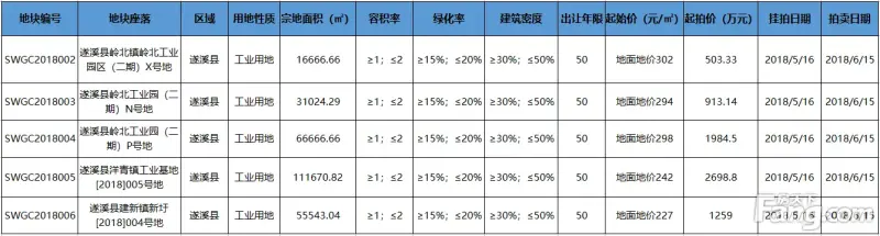 据公告文件,SWGC2018006号地块宗地面积为55543.04平方米,该地块位于遂溪县建新镇新圩[2018]004号地,容积率为≥1;≤2,规划土地用途为工业用地,出让年限为50年,起拍价为1259万元,地面地价起拍价为227元/平方米。