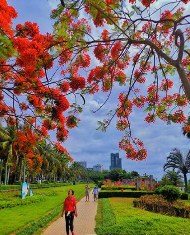 初夏五月,港城的凤凰花开得正盛。5月17日,笔者在霞山观海长廊红树林景区附近,看到多棵凤凰树高高的树顶犹如凤冠霞帔舞红妆,呈现出一片片富有渲染力的红色花海,艳美而热烈,成为夏季港城一道亮丽的风景线。