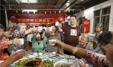 11月13日,霞山陈铁村长者食堂开业。晚宴上,长者食堂创办者黎剑华与老人举杯同贺。热心人自主出资